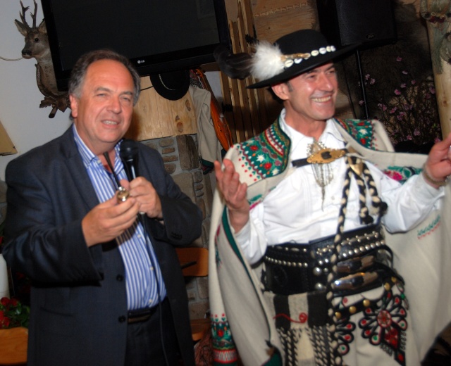 23. Bronisław Orawiec-Wyśni dziękuje Burmistrzowi Zakopanego Januszowi Majchrowi za oryginalną „fajkę Sabały” specjalnie wyprodukowaną w Przemyślu z okazji V Święta Fajki pod hasłem „Fajecko hej...”. |