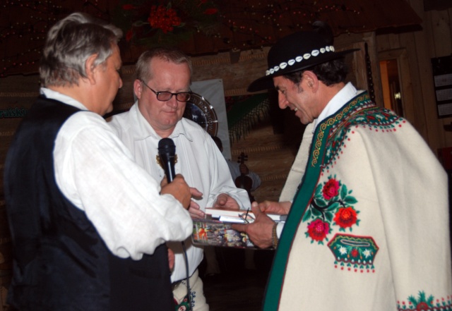 33. Od lewej: prezes Oddziału Nowy Targ ZP Alojzy Lichosyt i prezes ZP Maciej Motor-Grelok wręczają Bronisławowi Orawcowi-Wyśniemu materiały na temat ZP w Polsce. Zajazd Furmański, Zakopane, 11 sierpnia 2010 r. |