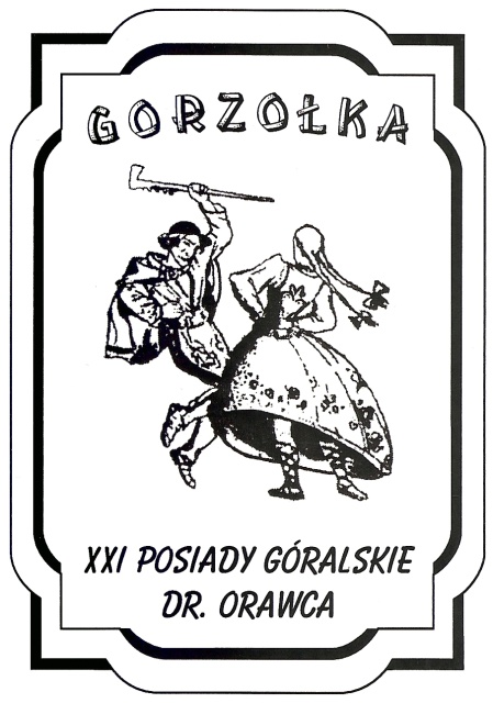55. Etykietka z butelki wódki serwowanej na Góralskich Posiadach Doktora Orawca z ryciną tańczącej pary góralskiej.