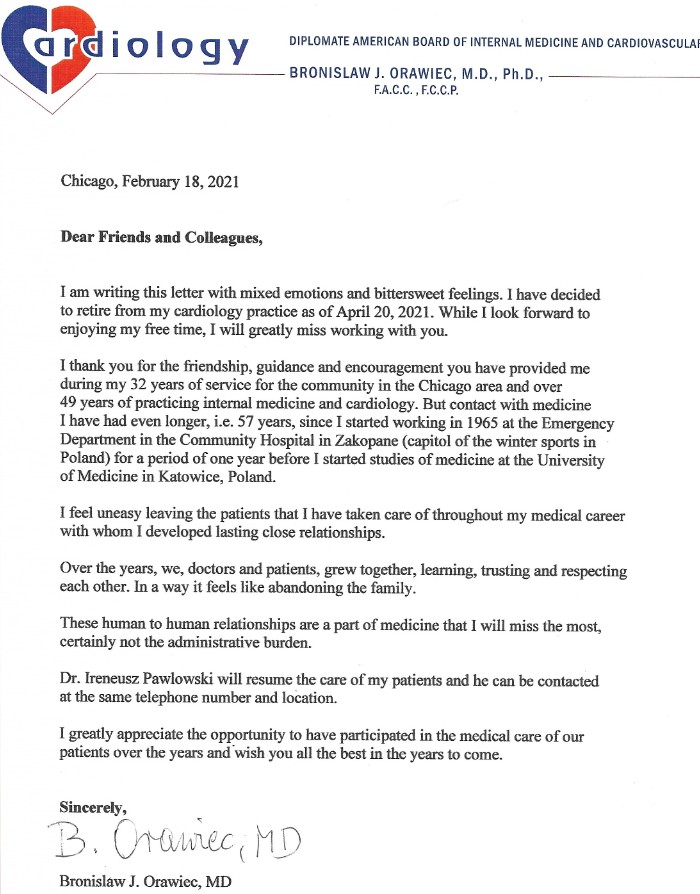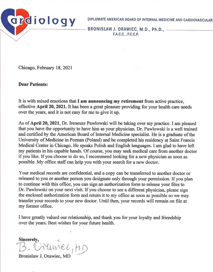 As of April 20, 2021, Dr. Ireneusz Pawlowski will be taking over my practice. I am pleased that you have the opportunity to have him as your physician. Dr. Pawlowski is a well‑trained and certified by the American Board of Internal Medicine specialist. He is a graduate of the University of Medicine in Poznan (Poland) and he completed his residency at Saint Francis Medical Center in Chicago. He speaks Polish and English languages. I am glad to have left my patients in his capable hands. Of course, you may seek medical care from another doctor if you like. If you choose to do so, I recommend looking for a new physician as soon as possible. My office staff can help you with your search for a new doctor.