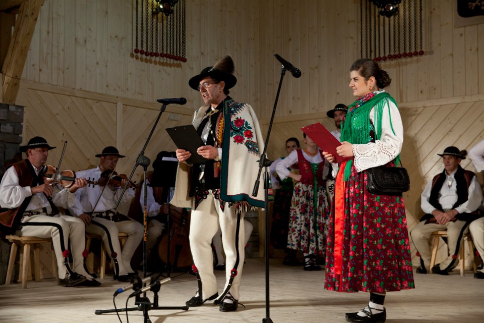 1. XXIII Góralskie Posiady Doktora Orawca. Przy mikrofonach konferansjerzy pierwszej części posiadów: dr Bronisław Orawiec-Wyśni oraz Ewelina Rzadkosz z Zespołem „Regle”. Gminny Ośrodek Kultury (GOK) w Poroninie. 29 maja 2015 r.