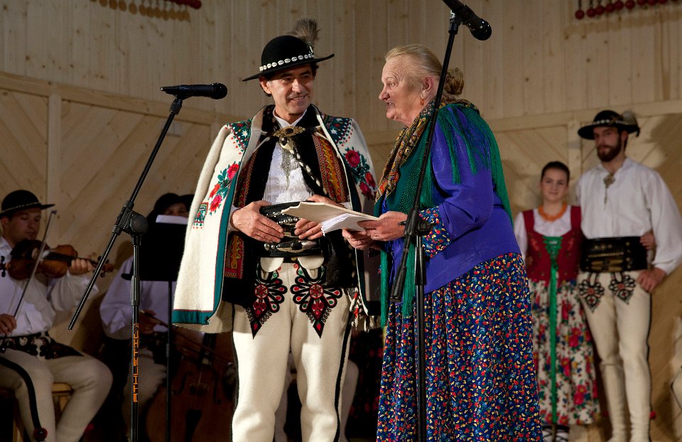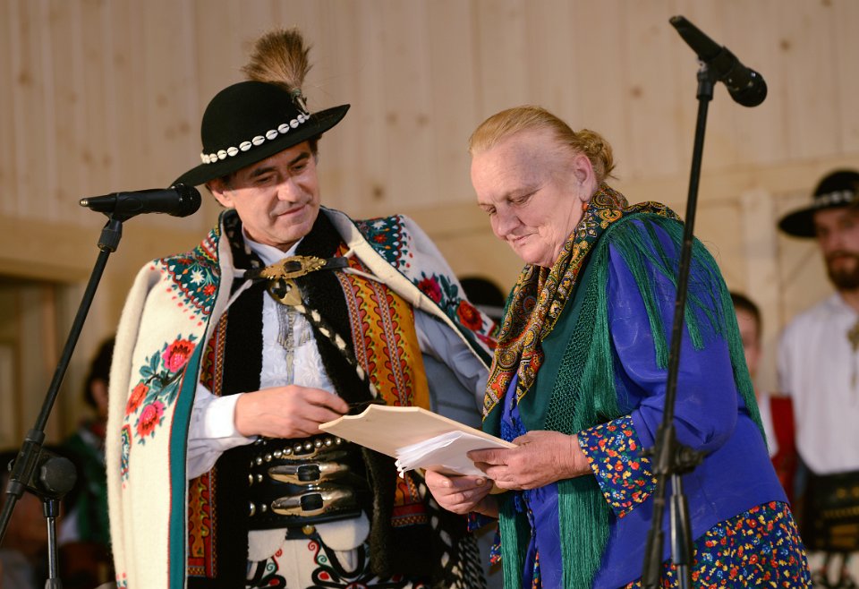 17. Przy mikrofonie gazda posiadów dr Bronisław Orawiec-Wyśni oraz Maria Stoch.