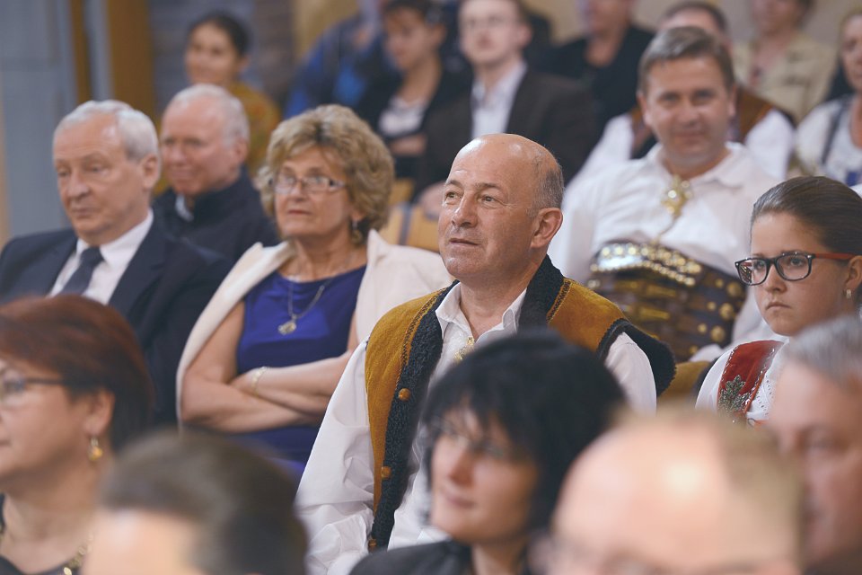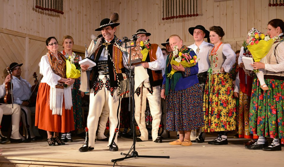 19. Organizator XXIII Góralskich Posiadów Doktora Orawca wręcza kierownictwu Zepołu „Regle” statuetkę „złóbcoków”, medal oraz wykonaną z brązu rzeźbę św. Jana Pawła II. Gminny Oœrodek Kultury w Poroninie. 29 maja 2015 r.