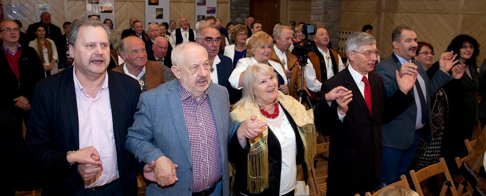 33. Zdjecie pamiątkowe organizatora dr. Bronisława Orawca-Wyśniego z Honorowymi Gośćmi XXIII Góralskich Posiadów oraz członkami Zespołu „Regle”. „Karczma Regionalna Baca”. Poronin, 29 maja 2015 r.
