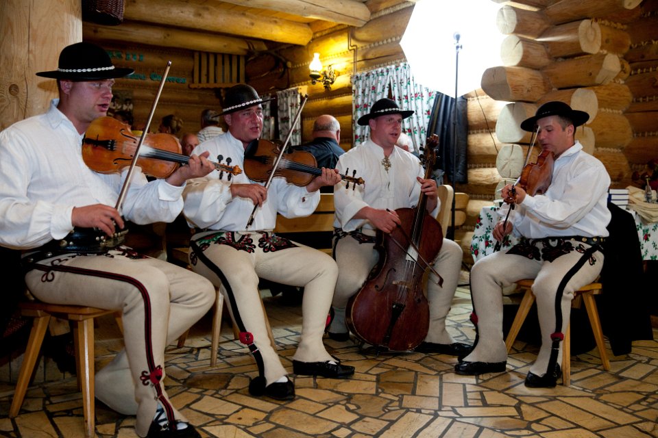 27. Część druga XXIII Góralskich Posiadów Doktora Orawca. Muzyka w składzie od lewej: Jan Trebunia-Tutka (skrzypce sekund, altówka, wokal), Andrzej Polak (skrzypce prym, secund, wokal), Paweł Trebunia-Tutka (skrzypce prym, altówka, bas, wokal), Stanisław Galica Kasecka (skrzypce secund, akordeon, wokal).