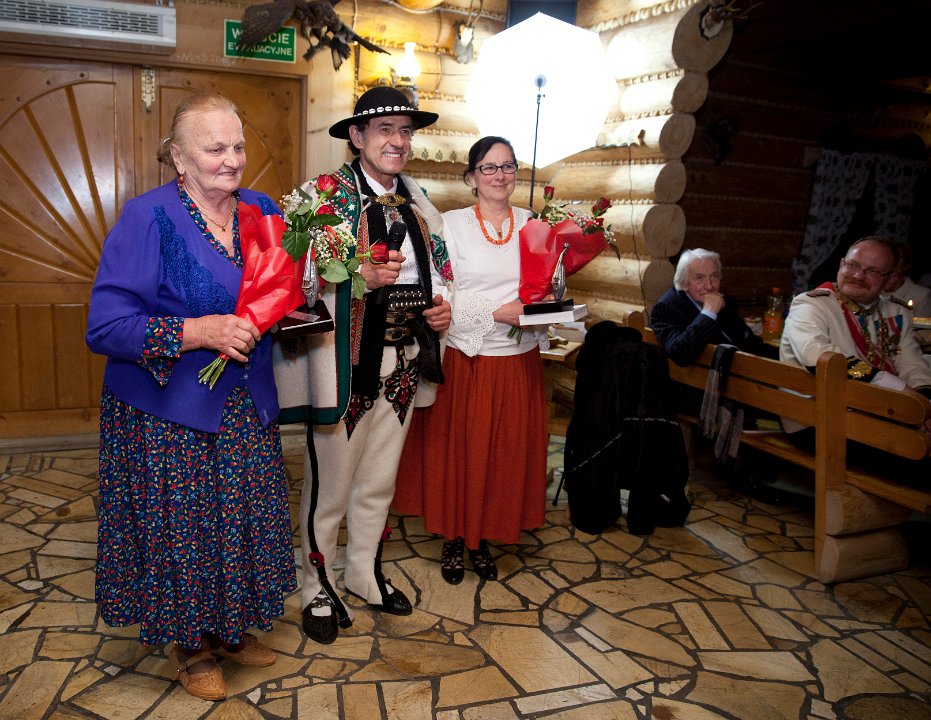 30. XXIII Góralskie Posiady Doktora Orawca. Po wręczeniu Honorowym Gościom statuetek, medali i wiązanek kwiatów. Od lewej: Maria Stoch, dr Bronisław Orawiec-Wyśni, Maria Dawidek.