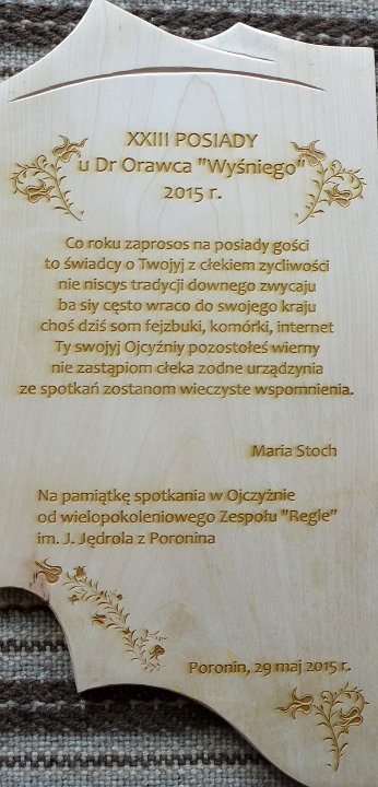 63. Pamiątkowa drewniana plakietka z wyrytym oryginalnym wierszem dla B. Orawca.