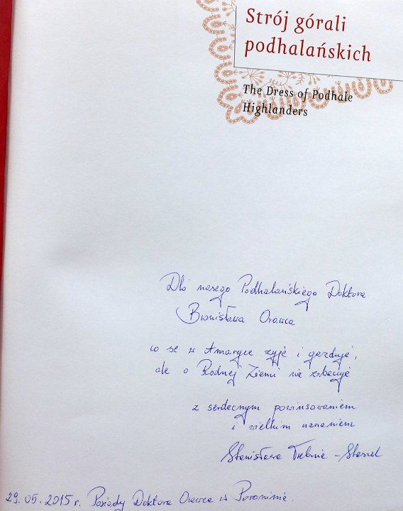 32. Dr Stanisława Trebunia-Staszel wręcza dr. Bronisławowi Orawcowi-Wyśniemu publikację pt. „Strój górali podhalańskich” z dedykacją: „Dlo nasego Podhalańskiego Doktora Bronisława Orawca co se w Ameryce zyje i gazduje, ale o Rodnej Ziemi nie zabacuje. Z serdecnym powinsowaniem i wielkim uznaniem”. Stanisława Trebunia-Staszel 29. 05. 2015 r. Posiady Doktora Orawca w Poroninie.
