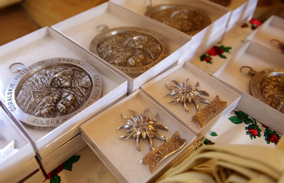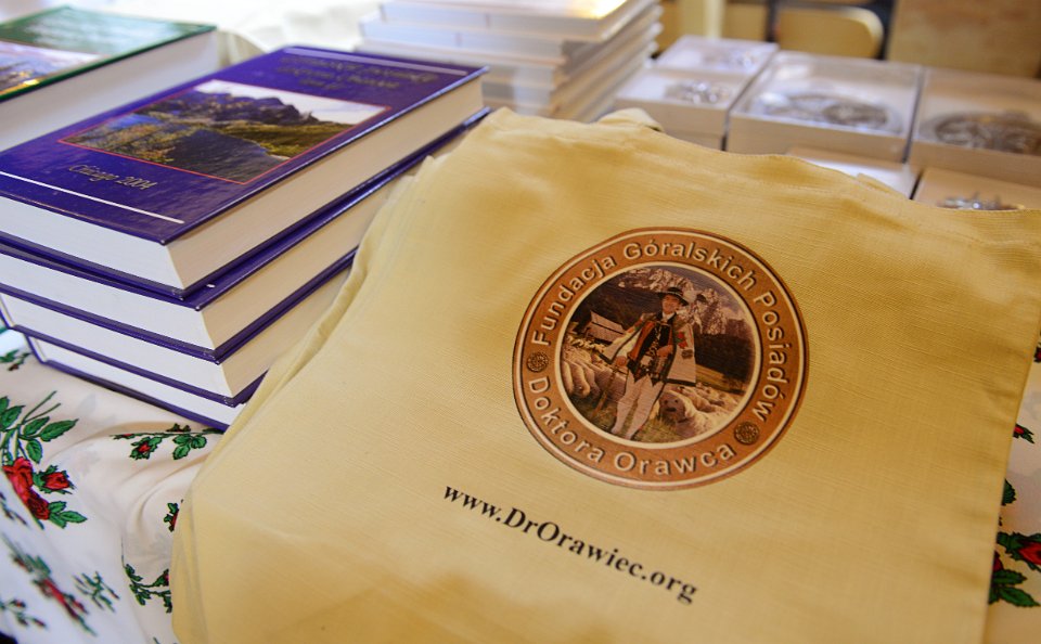 66. Torby z logo Fundacji Góralskich Posiadów Doktora Orawca, autorskie publikacje, medale Fundacji.