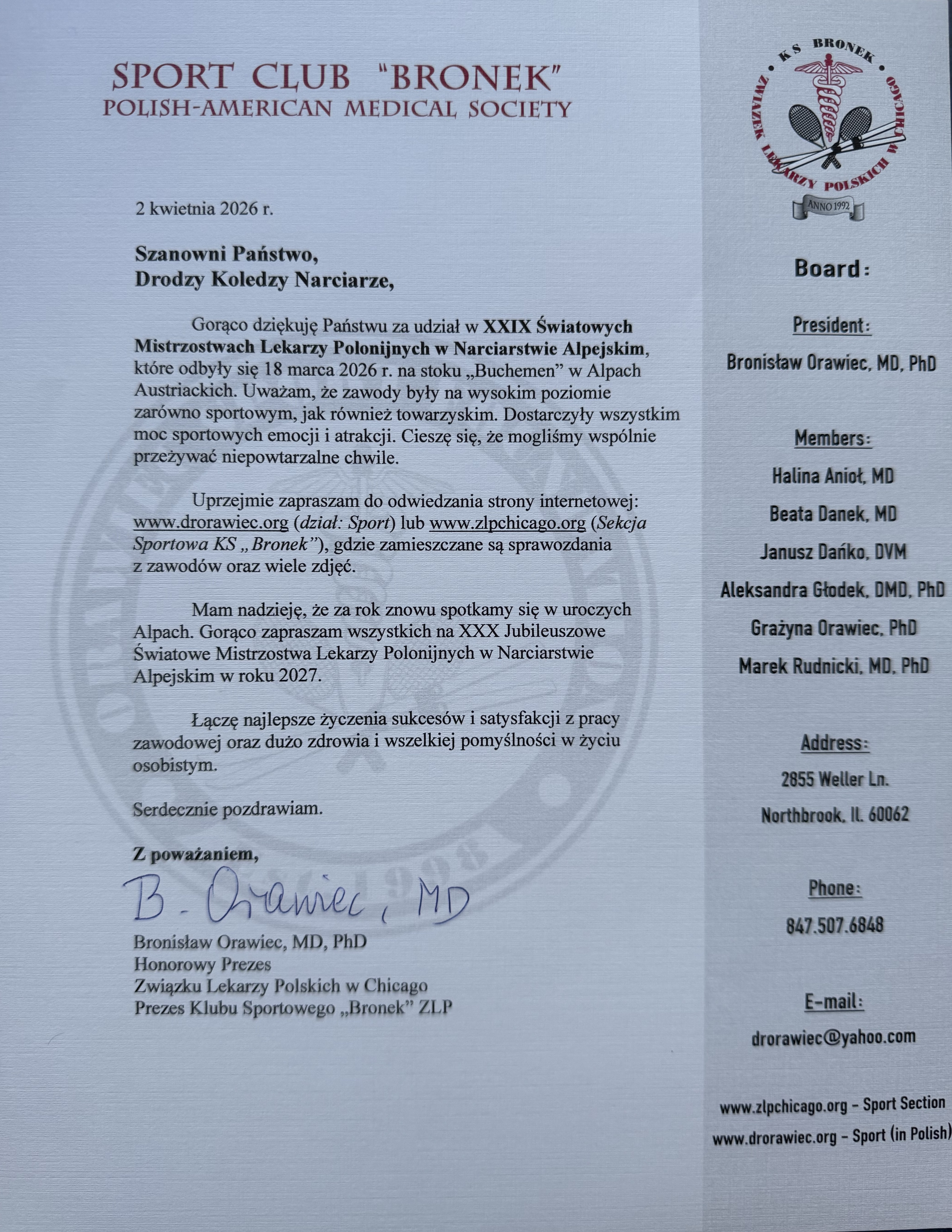 18 marca 2026 roku na stoku Buchemen w Alpach Austriackich odbyły się XXIX Światowe Mistrzostwa Lekarzy Polonijnych w Narciarstwie Alpejskim. Mistrzostwa zorganizował prezes KS „Bronek”, honorowy prezes Związku Lekarzy Polskich w Chicago dr Bronisław Orawiec. Bazę hotelową zimowiska przygotowali mgr. Wiesław Jabłoński prezes biura turystycznego Jawa-Reisen oraz były długoletni prezes Polskiego Towarzystwa Medycznego w Niemczech dr Zbigniew Kostecki.